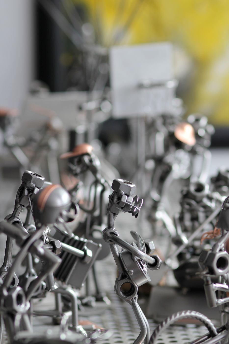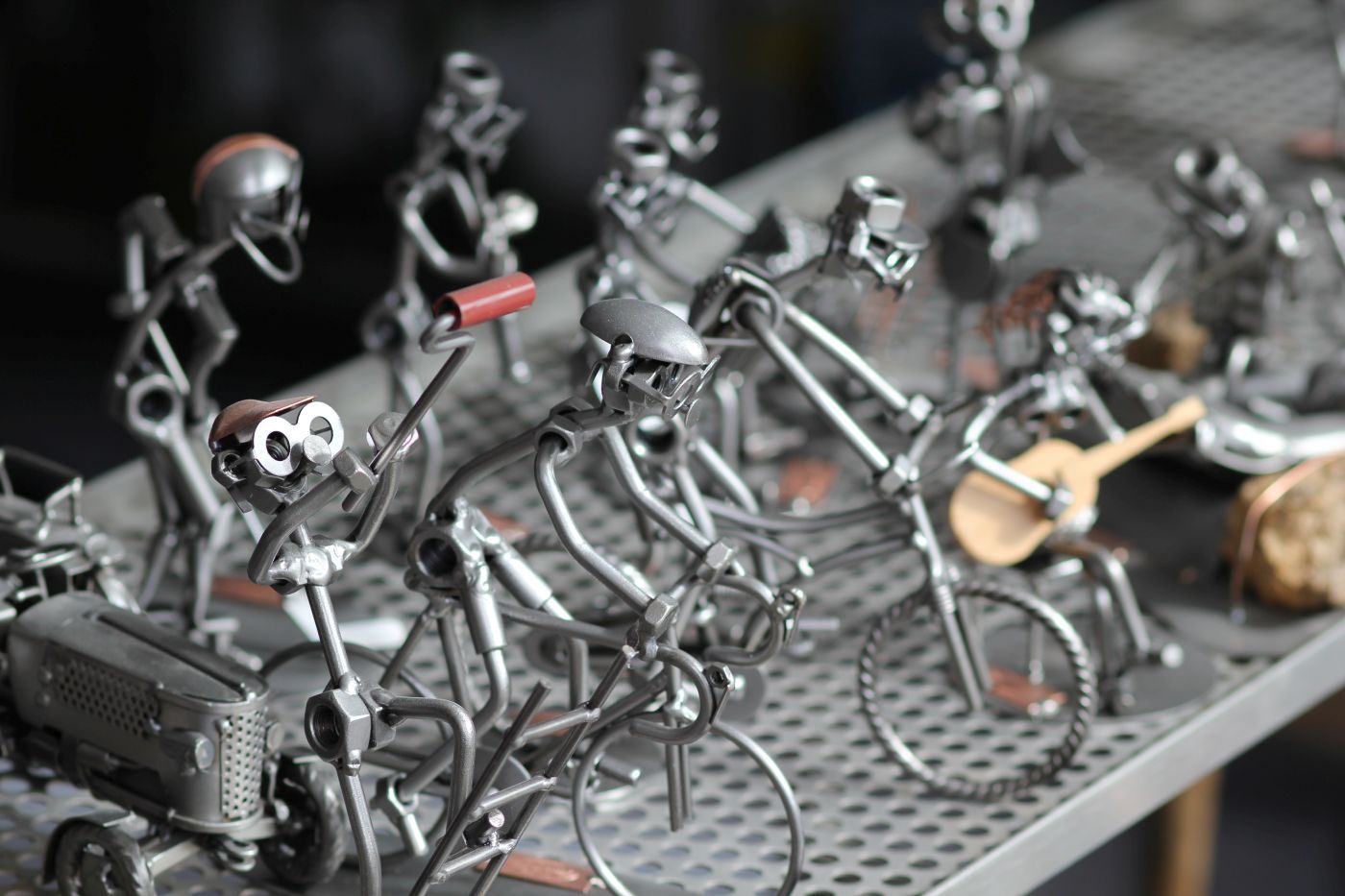 Diese Kunstwerke werden in mehreren kreativen Arbeitsprozessen von Hand gefertigt: Die Teile aus Stahl und Kupfer werden zuerst zurechtgeschnitten und dann in Form gebogen, sodass sie dann geschweißt werden können. Um ihnen besonders schönen Glanz zu verleihen, werden sie anschließend gründlich gebürstet und zuletzt lackiert. Jede Figur ist also ein absolutes Unikat und ein Blickfang für Büro und Wohnzimmer.